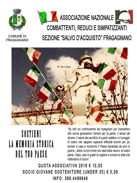 Il direttivo dell’associazione informa che è aperta la campagna di tesseramento per l’anno 2019 per i soci simpatizzanti e rivolge un appello ai GIOVANI, affinchè si accostino a questa realtà associativa, in modo che non vada dimenticato il valore della libertà e della democrazia.