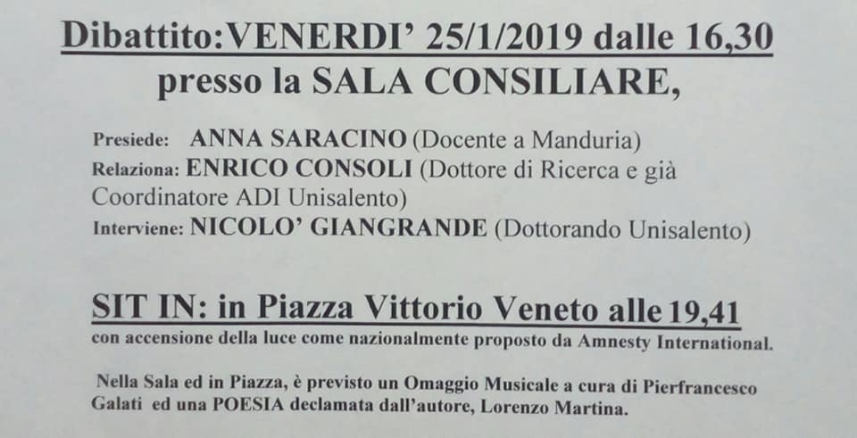 Il programma dell’evento prevede gli interventi di Anna Saracino, docente, dell’artista Enrico Consoli e di Nicolò Giangrande. Alle 19,41, come proposto da Amnesty International, in piazza Vittorio Veneto sarà accesa una luce per ricordare Giulio.