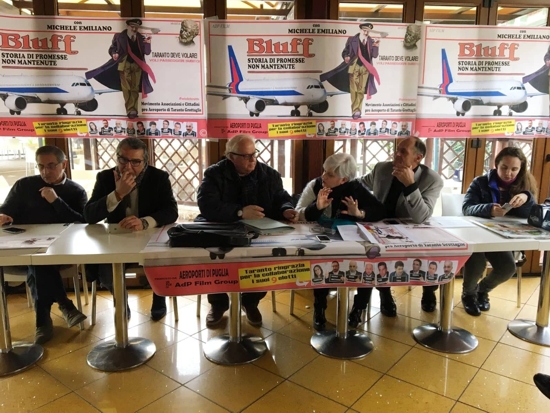 Sono stati, prima di tutto, illustrati i fatti sui quali i cittadini debbono essere informati, partendo dal boicottaggio da parte della politica barese, nei confronti delle giuste rivendicazioni dei tarantini. E’ stato, a riprova di ciò, mostrato il bozzetto di un grande manifesto, parodia della locandina di un noto film dove come protagonisti compaiono lo stesso Emiliano e i consiglieri regionali tarantini, che avrebbe dovuto essere posizionato davanti alla sede del Consiglio regionale a Bari, e la cui affissione è stata impedita all’ultimo istante. Si lascia immaginare da chi. “Questo poster è simbolo - così è stato spiegato - della volontà del Movimento cittadino di allargare adesso la protesta per gli impegni disattesi sulla riattivazione dei voli commerciali (passeggeri di linea), dalla presidenza regionale ai 9 consiglieri eletti a Taranto, considerati dunque, per la loro azione non efficace e non compatta, corresponsabili della situazione incresciosa” .