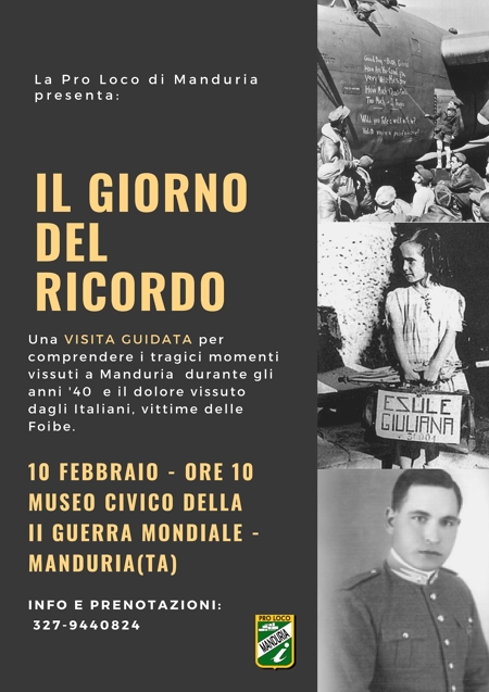 Il 10 febbraio è la giornata in cui la Repubblica Italiana ricorda le vittime delle foibe e l’esodo dei profughi giuliani, istriani e dalmati. Una ricorrenza civile voluta per non dimenticare quella pagina buia della nostra storia, per troppo tempo quasi del tutto ignorata. Per questo motivo, la Pro Loco di Manduria organizza una visita guidata nel Museo della Seconda Guerra Mondiale per rendere omaggio alle vittime manduriane delle Foibe e comprendere come la nostra città ha vissuto i terribili anni del conflitto mondiale. Sarà un'occasione per rivivere l'arrivo degli Alleati, raccontare la guerra dal punto di vista di chi allora era bambino, parlare della grande generosità di alcuni personaggi locali e scoprire gli oggetti di una vita quotidiana non troppo distante da noi.