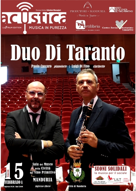 L’appuntamento è per venerdì 15 febbraio, con il Duo Di Taranto, composto daPaolo Cuccaro (pianoforte) e Lugi di Fino (clarinetto). Sul palco del Museo della Civiltà del Vino Primitivo a Manduria i due musicisti proporranno un repertorio incentrato sulle trasformazioni espressive avutesi tra ‘800 e ‘900, nell’ambito della musica colta: dal romanticismo di Brahms, Chopin e Schumann al brio dadaista di Poulenc, passando per le colonne sonore da film di Nino Rota, sino a giungere alla musica da camera contemporanea di Joseph Horovitz.