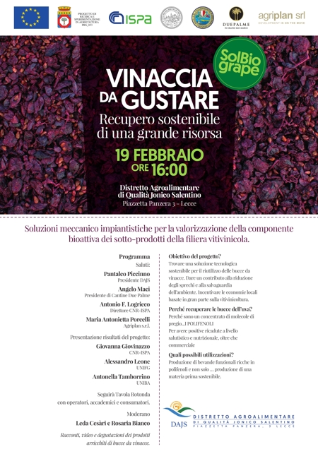 “Vinaccia da gustare – Recupero sostenibile di una grande risorsa” è il tema dell’incontro in programma martedì 19 febbraio alle 16 a Lecce, presso il Distretto Agroalimentare di Qualità Jonico-Salentina, per la presentazione del progetto “SolBioGrape”. L’incontro è organizzato dall’Istituto di Scienze delle Produzioni Alimentari del CNR di Lecce (CNR-ISPA) con il sostegno di Regione Puglia, Università di Foggia e di Bari, Cantina Due Palme e Agriplan srl.