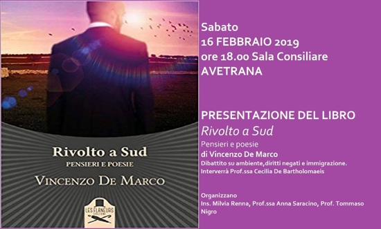 Vincenzo De Marco sarà ospite questa sera di un dibattito su ambiente, diritti negati e immigrazione, che si terrà presso la sala consiliare di Avetrana, per parlare della sua ultima raccolte di poesie, “Rivolto al Sud – Pensieri e Poesie” (Les Flaneurs Edizioni). Interverrà la prof.ssa Cecilia De Bartholomaeis. Ingresso libero. Inizio alle ore 18.