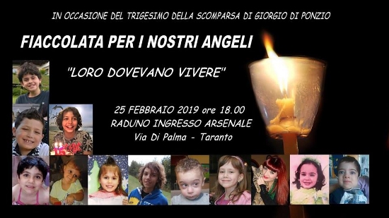 Il prossimo 25 Febbraio si terrà a Taranto una fiaccolata per ricordare tutte le piccole vittime dell’inquinamento industriale. L’ultimo evento luttuoso, la morte di Giorgio Di Ponzio, che ha ancora una volta profondamente scosso l’intera comunità tarantina, ha spinto altri genitori a raccontare, come già in passato, le storie di dolore e di sogni infranti che hanno accompagnato i pochi anni di vita dei propri figli. Le foto da loro inviate sono state raccolte su grandi manifesti che saranno affissi in città dal 18 febbraio, per ricordare che quei piccoli angeli avevano, oltre a un nome e un volto, anche un futuro, negato.