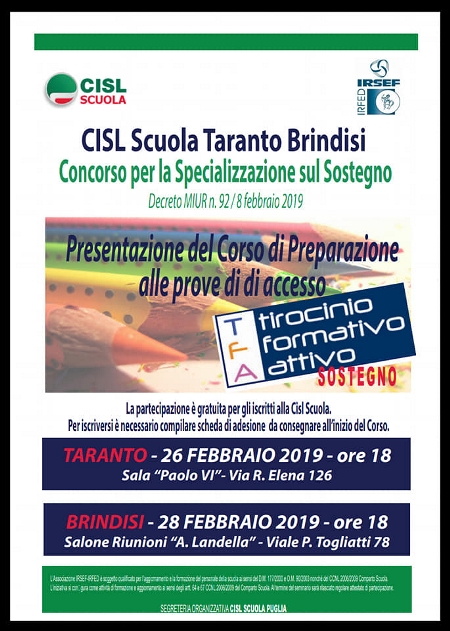La Cisl Scuola Taranto Brindisi e IRSEF IRFED terranno, nelle sedi provinciali della Cisl, due incontri di presentazione del Corso di formazione e di preparazione alla prova di accesso al Concorso per la specializzazione sul Sostegno (TFA).