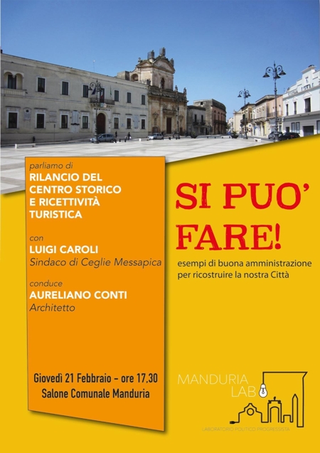 Il primo di questi incontri sarà appunto dedicato a “Centri storici e ricettività turistica” e vedrà la partecipazione del sindaco di Ceglie Messapica, città che in questi ambiti ha compiuto passi da gigante. Un prezioso contributo al confronto sarà dato dall’Architetto Aureliano Conti, componente del pool di tecnici che fu autore di un Piano Particolareggiato del centro storico di Manduria, che giace dimenticato in qualche scaffale del nostro municipio. A Manduria, questa sera, sala consiliare, ore 17:30».