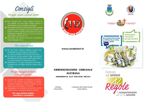 Grazie al comandante della caserma dei Carabinieri di Avetrana, il luogotenente Fabrizio Viva, e all’Amministrazione comunale (in particolare l’assessore Mimma Manna), è stata presentata una lodevole iniziativa. E’ stata stampata una brochure, ideata dal comandante Viva, contenente consigli utili agli anziani per evitare di essere raggirati e dunque truffati.