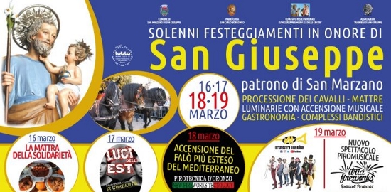Come di consueto anche per il 2019 San Marzano si veste di tradizione, devozione e pietà popolare. E con la perfetta sinergia e “attività collaborativa” tra il Comitato Feste Patronali, la parrocchia San Carlo Borromeo, nonché l’Amministrazione Comunale e l’Associazione Trainieri di San Giuseppe, il paese quest’anno vivrà una festa che durerà ben 4 giornate.