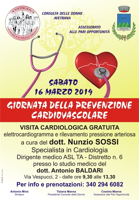 La Consulta delle Donne di Avetrana, in collaborazione con l’assessore alle Pari Opportunità Cosima Manna, organizza per sabato 16 marzo una Giornata di Prevenzione Cardiovascolare.