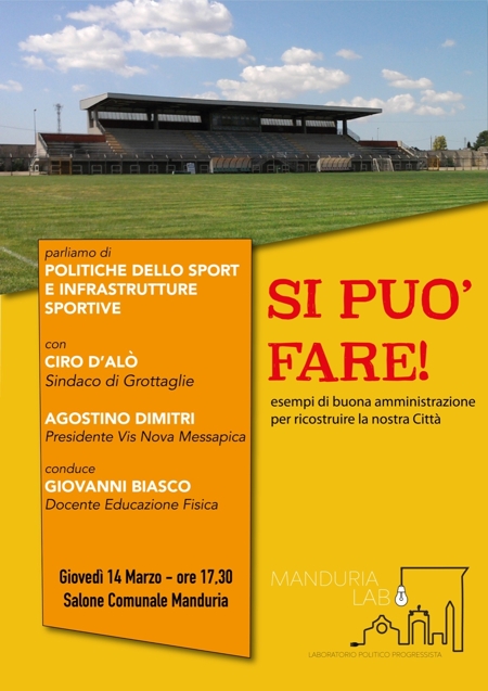 Secondo appuntamento con “Si può fare”, gli esempi di buona amministrazione dei centri limitrofi proposti dal laboratorio politico progressista “Manduria Lab”. Dopo la serata in cui si è parlato della valorizzazione del centro storico (ospite il sindaco di Ceglie Messapica), questa sera, alle 17,30, nell’aula consiliare, si parlerà di sport con Ciro D’Alò, sindaco di Grottaglie, Città Europea dello Sport per il 2020. Condurrà la serata Giovanni Biasco, docente di Educazione Fisica, e interverrà anche Agostino Dimitri, presidente della società sportiva Vis Nova Messapica di Manduria.