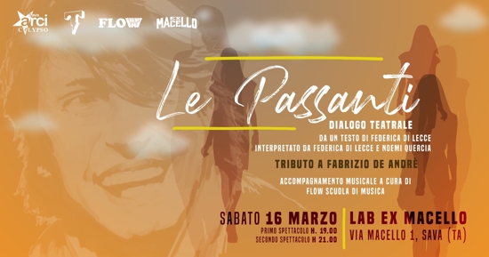 In occasione del ventesimo anniversario della morte del grande cantautore italiano Fabrizio De Andrè, su iniziativa del circolo Arci Calypso, ci sarà la possibilità di assistere, con un doppio orario (alle 19 e alle 21), allo spettacolo “Le Passanti”, un dialogo teatrale inedito scritto dalla giovane autrice biscegliese Federica Di Lecce, e liberamente ispirato all’omonimo testo di Fabrizio De Andrè.