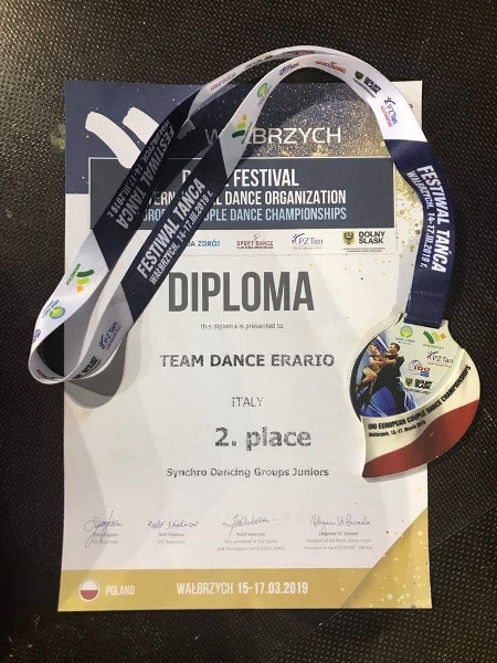 Dalla Polonia la Team Dance Erario Academy ritorna con una prestigiosa medaglia d’argento. Un piazzamento che gratifica il loro dei maestri Gregorio Erario e Pamela Costa e che suona come un ennesimo riconoscimento per la qualità, per l’armonia e per il livello tecnico delle sei ragazze manduriane: Francesca Pia Dimitri di anni 14, Giulia Bitonto di anni 14, Ilaria Tornese di anni 14, Lara Caló di anni 13, Martina Bitonto di anni 14 e Lucia Dimilito di anni 13.