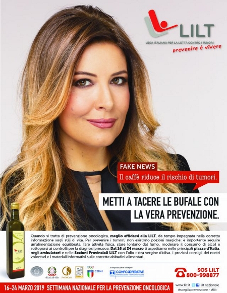 La Settimana Nazionale per la Prevenzione Oncologica, istituita con decreto del Presidente del Consiglio dei Ministri sin dal 14 gennaio 2001, come sempre ribadirà il ruolo dell'olio extravergine di oliva (italiano) quale primo testimonial del benessere a tavola, abbinandone la portata simbolica al volto della nota blogger e opinionista Selvaggia Lucarelli, da sempre in prima linea contro le “bufale” circolanti in internet.
