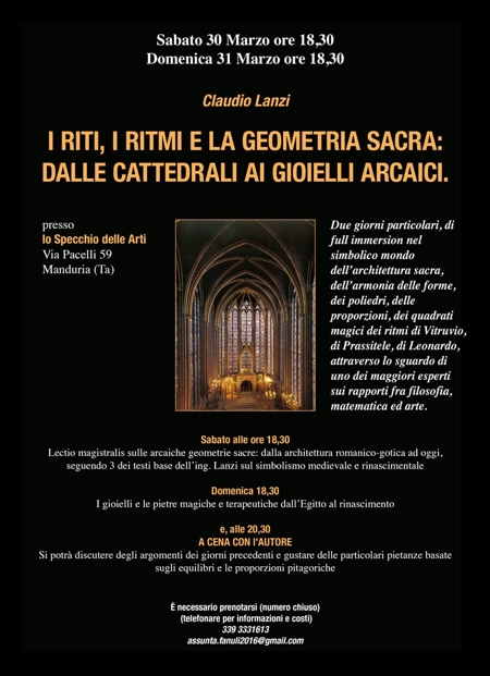 Sono nel programma della nuova iniziativa dell’atelier culturale “Lo specchio delle arti”: due incontri, nel prossimo fine settimana, con Claudio Lanzi, sul tema “I riti, i ritmi e la geometria sacra: dalle cattedrali ai gioielli arcaici”. Sabato, alle 18,30, nella sede dell’atelier (in via Pacelli), si partirà con la lectio magistralis; domenica, invece, sempre alle 18,30, la seconda conferenza. Iniziativa (realizzata in collaborazione con Popularia) che si concluderà alle 20,30 di domenica, con una cena con l’autore, durante la quale si potrà discutere degli argomenti trattati e gustare particolari pietanze basate sugli equilibri e le proporzioni pitagoriche.