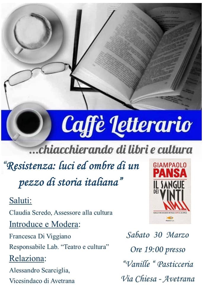 Libri e cultura nel caffè letterario in programma questa sera presso la pasticceria Vanille di Avetrana. Alle 19, in via Chiesa, si parlerà del libro di Giampaolo Pansa “Il sangue dei vinti”, ma si discuterà anche sul tema “Resistenza, luci ed ombre di un pezzo di storia italiana”.
