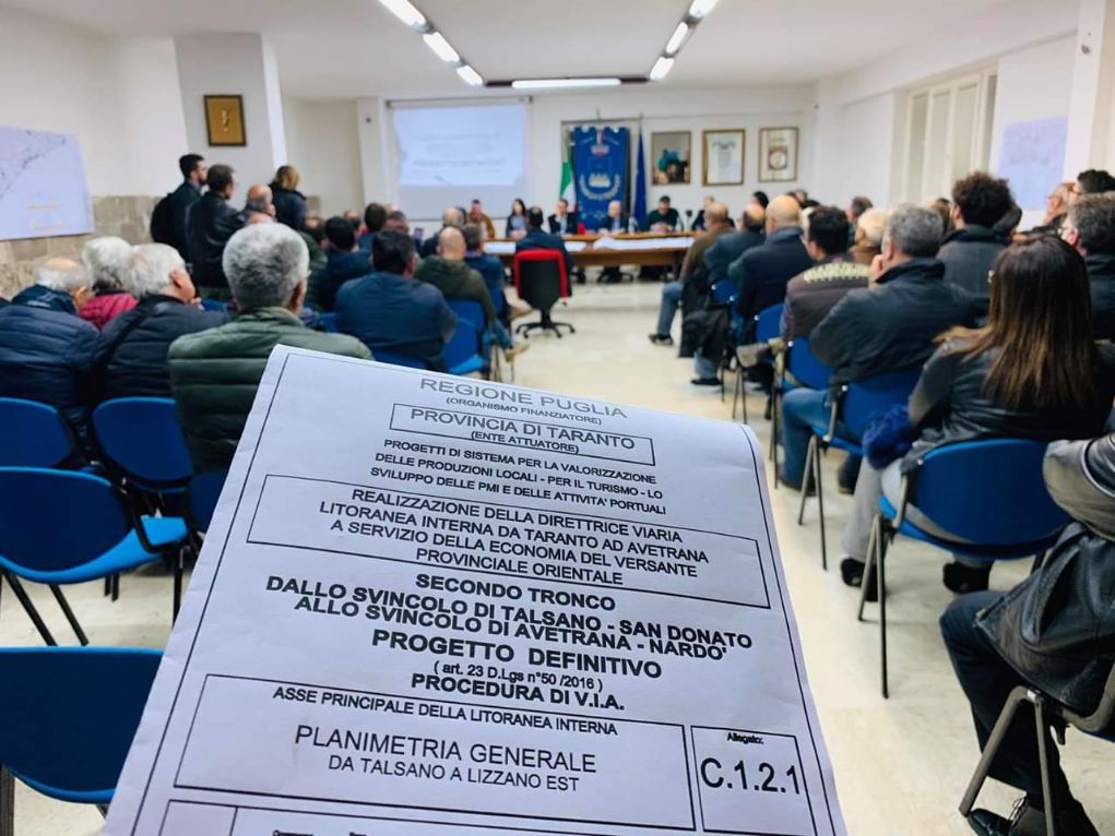 A promuovere l’iniziativa pubblica, durante la quale è stato presentato il progetto definito, è stata l’Amministrazione comunale di Avetrana. Il sindaco Antonio Minò ha invitato, oltre al progettista, anche il presidente della Provincia di Taranto, Giovanni Gugliotti, il presidente dell’Unione dei Comuni “Terre del Mare e del Sole”, Alfredo Longo, e i sindaci di tutti i Comuni interessati alla realizzazione di questa arteria, che, parallela alla litoranea, dovrebbe consentire un più snello e veloce collegamento fra Taranto e l’ultimo centro dell’area orientale della provincia.