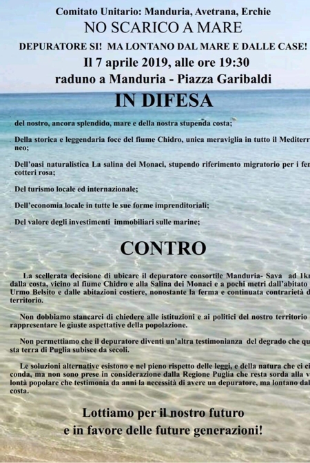 Ecco l’appello del comitato unitario di Manduria, Avetrana ed Erchie “NO SCARICO A MARE”
