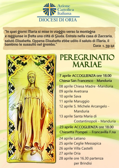 Dal 7 al 28 aprile 2019, l’Azione Cattolica della Diocesi di Oria custodirà l'immagine di Maria Immacolata della Domus Mariae; in questi giorni diverse comunità della Diocesi vivranno la "Peregrinatio Mariae", recandosi a visitare in giorni differenti l'immagine della Vergine per vivere un momento di preghiera.
