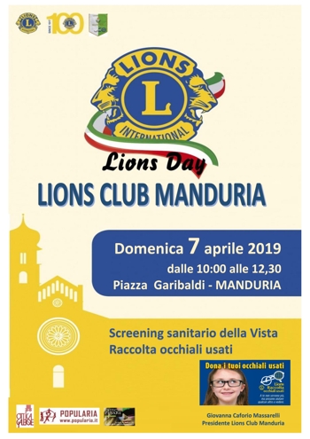 Si celebra questa mattina, dalle ore 10 alle ore 12, in piazza Garibaldi il Lions Day promosso dal Lions Club di Manduria. L’obiettivo è quello di far conoscere le iniziative portate avanti dai Lions club e gli scopi che le animano. Sarà offerto alla cittadinanza uno screening gratuito della vista, messo a disposizione dall’ottica Galeone e si effettuerà la raccolta degli occhiali usati, service internazionale, finalizzato a rigenerare qualcosa di superfluo per un bisogno essenziale.