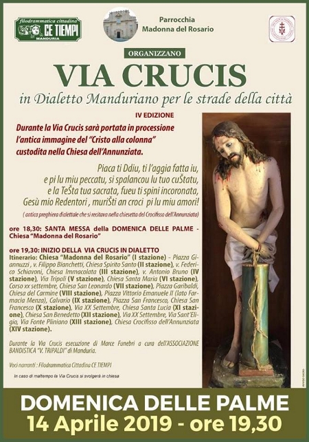 Domenica, 14 aprile, in occasione della Domenica delle Palme, si svolgerà, a Manduria, la “Via Crucis in dialetto manduriano per le strade della città”, iniziativa, nata nel 2016, Anno Santo della Misericordia, con l’obiettivo di vivere, come cristiani, un forte momento di preghiera e di fede, giunta, quest’anno, alla sua IV edizione.