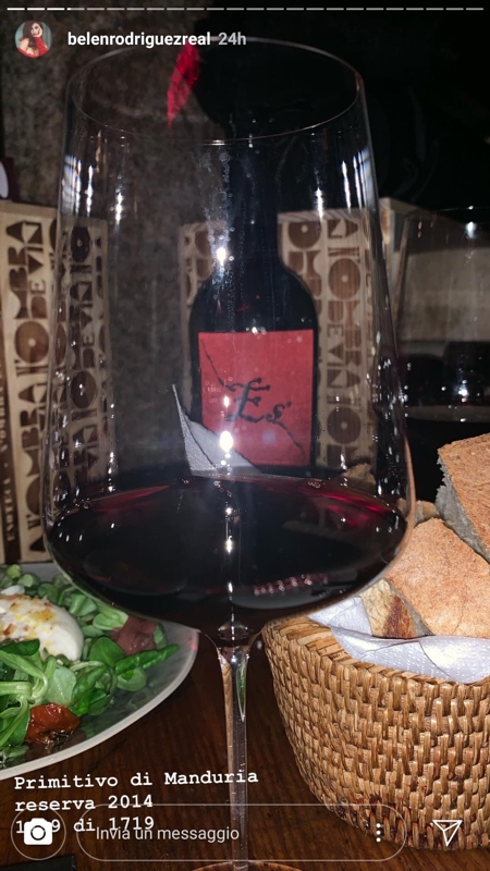 In una foto pubblicata sul proprio profilo Instagram, Belen pubblica una foto in cui compare una bottiglia di Primitivo di Manduria dell’azienda di Gianfranco Fino e, in particolare dell’annata 2014.