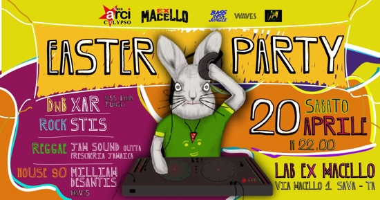 Ritorna l’Easter Party, la grande festa pasquale promossa dal circolo Arci Calypso di Sava. E’ in programma questa sera (sabato, vigilia di Pasqua), a partire dalle ore 22, presso il laboratorio urbano “ex macello” di via Macello a Sava.