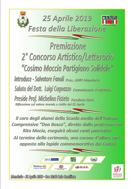 Si svolgerà stamani, presso la sala consiliare del Comune di Manduria, la premiazione della seconda edizione del concorso scolastico “Cosimo Moccia – partigiano solidale”, iniziativa promossa dalla sezione di Manduria dell’Anpi, intitolata proprio al carabiniere Moccia.