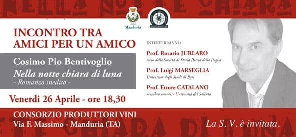 Per onorare la sua memoria, oggi (venerdì 26 aprile), sarà presentato al pubblico nel corso di una cerimonia che avrà luogo, alle 18,30, presso il Museo del Primitivo dei Produttori di Manduria. Ne parleranno Rosario Iurlaro, socio della Società di Storia Patria della Puglia, Luigi Marseglia, dell’Università di Bari, ed Ettore Catalano, membro onorario dell’Università del Salento.