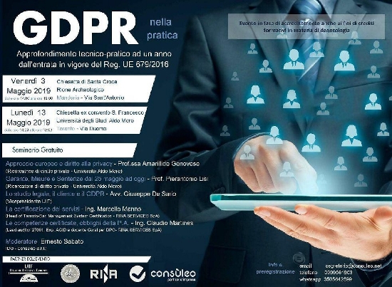 L'oggetto del seminario di studi è l'approfondimento tecnico-pratico del GDPR ad un anno dall’entrata in vigore del Reg. UE 679/2016