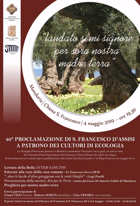 «Il tema torna ad essere attuale dopo la pubblicazione (24 maggio 2015) della lettera “Laudato sì” di Papa Francesco» è riportato in una nota dei Frati Minori e dell’Ordine Francescano Secolare. «Per questo 40° anniversario, i Frati Minori e l’Ordine Francescano Secolare offrono un incontro di riflessione e di preghiera, che avrà luogo sabato 4 maggio, alle ore 19,30, presso la chiesa San Francesco di Manduria».