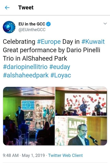 Nel concerto al suggestivo Shaheed Park di Kuwait City, in collaborazione con Lapa Loyac, il discorso di apertura è stato tenuto dal Ministro Plenipotenziario dell’EU in Kuwait, Sua Eccellenza Alar Olljum.