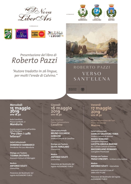 Continua la stagione del “Pro Liber: i caffè letterari” e oggi (mercoledì 15 maggio), alle ore 18.30, Manduria ospiterà Roberto Pazzi con il suo ultimo lavoro edito da Bompiani “Verso Sant’Elena”.