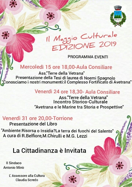 Il secondo appuntamento è fissato per venerdì 24 maggio, alle ore 18,30, con l’incontro storico-culturale sul tema “Avetrana e le marine fra storia e prospettive”. Il terzo e ultimo appuntamento si svolgerà, infine, il 31 maggio con la presentazione del libro “Ambiente: risorsa o insidia? La terra dei fuochi del Salento”, a cura di R. Belfiore, M. Chirulli e M. G. Lezzi.