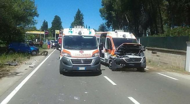 Incidente lungo la circonvallazione Taranto-Lecce nel pomeriggio: coinvolti un’ambulanza (che poi è uscita fuori strada) e due auto. Il bilancio di cinque feriti.