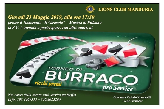 Giovedì (23 maggio), alle ore 17:30, presso il ristorante “Il Girasole”, sito in Marina di Pulsano, viale dei Micenei, 167, avrà luogo il Torneo di Burraco organizzato dal Lions Club di Manduria in favore dell’LCIF (Lions Clubs International Foundation).