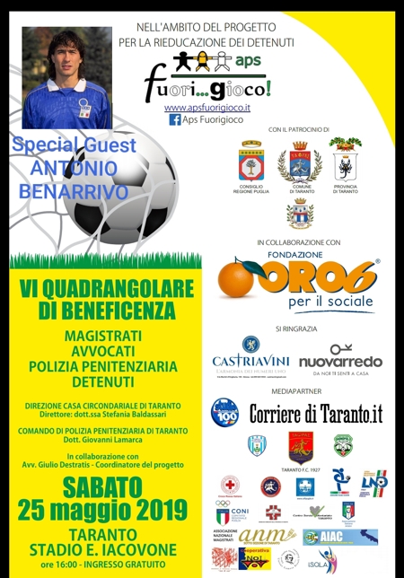 Di rilevo i nomi del calcio italiano che aderiscono ogni anno all’iniziativa: dopo Gianni Rivera, Nicola Legrottaglie, Antonio Cabrini, Claudio Gentile, Franco Selvaggi e Francesco Moriero, in questa sesta edizione interverrà l’ex calciatore del Parma dei miracoli e della Nazionale Italiana Antonio Benarrivo (Vicecampione del mondo ad Usa '94 e vincitore più volte di trofei nazionali ed internazionali) che sabato mattina parteciperà alla conferenza stampa dell’evento all’interno del Penitenziario di via Magli, per poi dare il calcio d’inizio nel pomeriggio al quadrangolare di calcio.