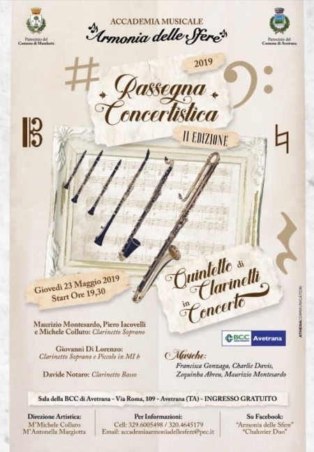Alle 19,30, nella sala delle conferenze della BCC di Avetrana, si esibirà un quintetto di clarinetti