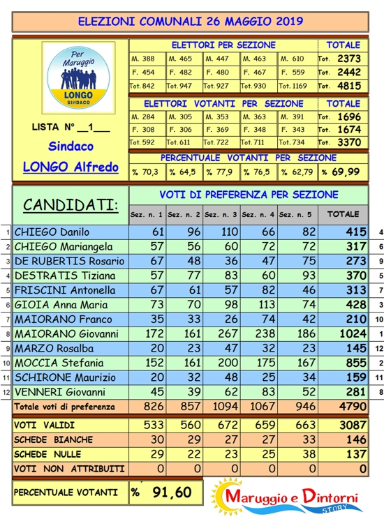 Ecco l’ultimo responso delle Comunali 2019 di Maruggio: le preferenze per tutti i candidati.