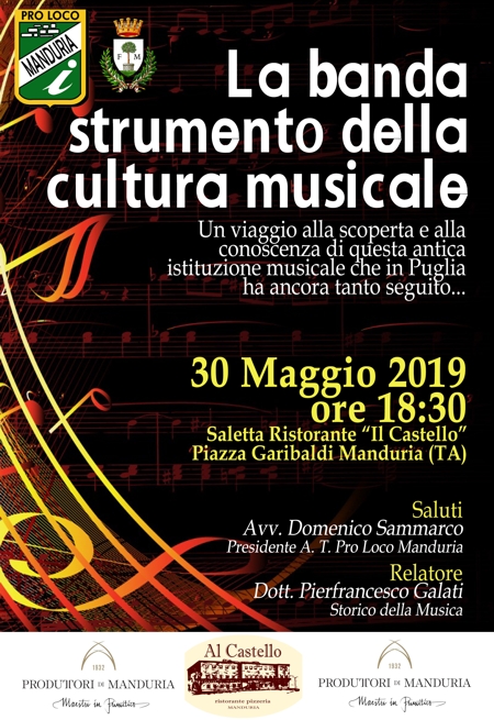 Domani (giovedì), alle ore 18:30, presso la saletta del ristorante "Al Castello" si terrà ‘La banda strumento della cultura musicale’, un interessante seminario sulla cultura bandistica in Puglia, a cura di Pierfrancesco Galati Argomento cardine del seminario saranno le origini di questa istituzione e la sua diffusione fino ai nostri giorni.