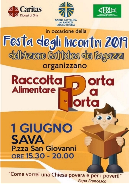 Oggi (sabato), dalle ore 15.30 alle ore 20.30, si svolgerà a Sava la “Raccolta alimentare Porta a Porta”, iniziativa della Caritas diocesana di Oria, divenuta un evento stabile in diocesi già da anni.