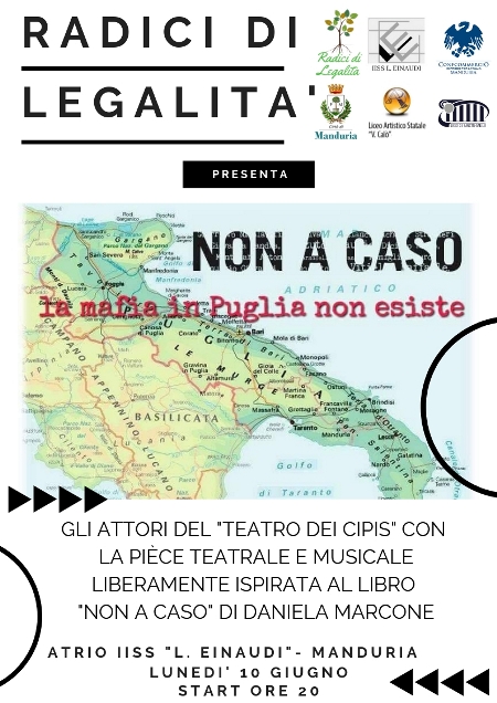 L’appuntamento finale della rassegna sarà lo spettacolo teatrale e musicale realizzato dalla compagnia “Il teatro dei Cipis” e intitolata “Non a caso in Puglia la mafia non esiste”, liberamente tratto dal libro di Daniela Marcone “Non a caso”, testo che, scritto a più mani, dà voce alle storie di tanti ragazzi, donne e uomini morti per un ideale di giustizia che sta a tutti noi realizzare.
