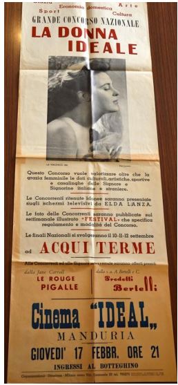 Il secondo esempio di programmazione alternativa offerta dalle sale cinematografiche di Manduria chiama l'attenzione al modo in cui il glamour e il fascino dell'industria cinematografica è stato sfruttato per influenzare e dare forma al pubblico in quanto consumatori. Tra gli artefatti condivisi con i CineRicordi archivio è un manifesto del 1954 che pubblicizza un concorso per trovare la 'Donna Ideale’ (vedi Fig. 12). Il concorso locale di questo concorso nazionale si è tenuta al Cinema Ideal, uno dei tre cinema della città, gestito dalla famiglia Miccoli.