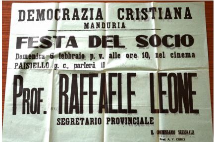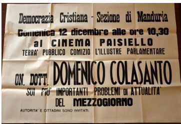 Un'altra tendenza di programmazione che emerge dai manufatti di crowdsourcing è l'uso dei cinema locali come sede di eventi politici. Nel corso degli anni Cinquanta, il cinema Paisiello di Manduria ha ospitato una serie di incontri politici con i relatori ospiti della Democrazia Cristiana, il partito allora al potere a livello nazionale. Un poster del 1952 (Fig. 15) pubblicizza un dibattito pubblico sulle sfide sociali ed economiche che le regioni del Sud Italia si trovano ad affrontare,