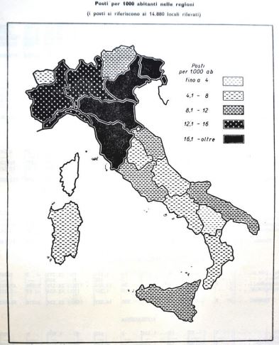Manduria e Amelia sono due città di medie dimensioni, tra le dieci e le venticinquemila abitanti. Nonostante la loro popolazione relativamente piccola, entrambe le città avevano una vivace attività cinematografica negli anni '50, che ruotava intorno a cinema commerciali, parrocchiali e all'aperto. Questo è in qualche modo in contrasto con la narrativa tradizionale associata al consumo di cinema in regioni centrali e meridionali come l'Umbria e la Puglia, che storicamente hanno avuto la tendenza a sottolineare la più limitata disponibilità di posti a sedere per persona rispetto alle altre regioni del nord, dove il rapporto era molto maggiore (vedi Fig.3). Mentre tali dati statistici forniscono una panoramica dell'infrastruttura cinematografica della nazione, essi allo stesso tempo rafforzano lo spartiacque nord-sud che caratterizza gran parte della storia sociale, culturale e politica italiana. Questa visione oppositiva della rete cinematografica nazionale, che evidenzia una maggiore concentrazione di spazi cinematografici nelle regioni settentrionali, si presta a una visione disomogenea della storia del cinema italiano, incentrata sui grandi centri urbani dove i dati relativi alla programmazione e alla mostra sono più facilmente disponibili. Tuttavia, attraverso un metodo di crowdsourcing, siamo stati in grado di iniziare a mettere insieme frammenti di un'evidenza che possa ispirare la nostra comprensione dei contesti di visione locale; un approccio che, per citare John Caughie, privilegia le "piccole narrazioni del cinema" e le loro potenzialità di deragliare [.....] il grande racconto" (Caughie 2016: 21). E 'con questa prospettiva in mente che noi analizziamo il funzionamento dell'industria cinematografica a Manduria e Amelia e l'impatto che essa ha avuto sul tessuto della vita quotidiana nell'Italia provinciale.