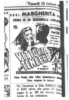 Se la promozione delle produzioni cinematografiche americane era nelle mani degli studi hollywoodiani, che ha affrontato le campagne di marketing "con lo stesso zelo e la stessa pianificazione metodica di una pianificazione generale"(Lukk 1997: ix), la questione di come questo tipo di promozione sia stata adatta ad attrarre il pubblico in Italia è di natura più complessa, soprattutto a causa della disponibilità limitata di materiale d'archivio che ci permette di ricostruire le tattiche utilizzate dai locali esercenti. Alcuni dei manufatti condivisi con l'archivio CineRicordi hanno contribuito a riempire questo spazio espositivo, offrendo una maggiore comprensione dei modi in cui il marketing globale è stato adattato a livello regionale. Il film di Mark Robson, Bright Victory (Vittoria sulle tenebre) (1951), ne è un esempio affascinante. Il film è arrivato a Manduria nel marzo 1952, dopo averlo presentato in anteprima il 15 febbraio al cinema Margherita di Bari (capoluogo della regione) dove è stato prodotto per cinque giorni. In vista della prima del film al Margherita (il più grande cinema barese), il giornale locale la Gazzetta del Mezzogiorno pubblicò un annuncio [cfr. Fig. 4] che metteva in evidenza i successi del film agli American Critic Awards. Aggiungendo al senso dell'occasione circostante questa nuova pubblicazione (e sottolineando il desiderio del proprietario del cinema di massimizzare favorevolmente l'opportunità di incasso per il box-office), l'annuncio ha anche informato gli avventori che le membership-card non sarebbero state accettate per uno sconto. Per tutti i frequentatori del cinema che sono stati scoraggiati da questa sospensione degli sconti per i membri, l'annuncio ha mirato a un pubblico con un’offerta promozionale di un produttore locale di detersivo per bucato. Cercando di attrarre spettatrici donne in particolare, l'offerta ha promesso un campione gratuito di 200g di detersivo per il lavaggio alle prime 250 donne che sono entrate al cinema (vedi Fig. 4).
