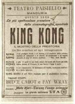 Un diverso tipo di artefatto proveniente dal pubblico, il poster del film per la proiezione di King Kong (Merian C. Cooper ed Ernest B. Schoedsack, 1933) al Teatro Paisiello in Manduria, abbinata alle memorie trovate in un volume edito sulla città, illustra un altro esempio delle iniziative creative degli esercenti volte ad attrarre il pubblico locale. Il film è stato presentato in anteprima a Bari il 7 dicembre 1933. Da qui, il film è stato distribuito a Taranto, Lecce e Brindisi nel 1934 (tra gennaio e agosto) prima di arrivare alla fine a Manduria, dove fu presentato due anni dopo (1935) al Teatro Paisiello. Il lungo viaggio che questo film ha intrapreso, per viaggiare da una città principale all’area rurale circostante, non era insolito all'epoca e rimase una pratica comune nel dopoguerra: il materiale d'archivio di Candeloro, infatti, ci permette di ricostruire il movimento di un'altra opera d'arte di Vittorio De Sica, I bambini ci guardano (The Children Are Watching Us, 1944), che ha debuttato a Bari il 21 novembre 1944, e arrivò a Manduria alla fine del 1945.