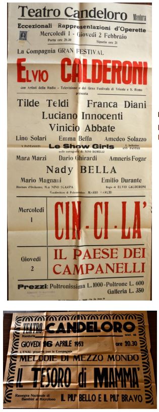Come molti cinema nelle aree urbane, anche il Candeloro ha ospitato una vasta gamma di performance cinematografiche, che ha permesso al pubblico di vedere uno spettacolo musicale e un film la stessa sera. Nel contesto italiano, questa forma ibrida di intrattenimento, che inizialmente è emersa come parte dell'esperienza cinematografica europea degli anni '30 e '40 (Morash 2002: 176; Frith et al 2016: 12), spesso con attori che hanno lavorato sia sullo schermo che fuori dallo schermo ha contribuito ad un senso di familiarità tra il pubblico e le star. La programmazione di manufatti condivisi dalla famiglia Candeloro evidenzia come i gestori locali abbiano cercato di giovare da questi eventi cross-mediatici.