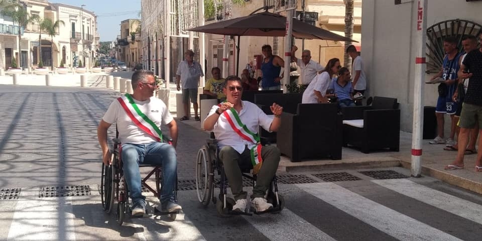 Una gara simbolica fra amministratori in carrozzina come forma di sensibilizzazione verso la necessità di eliminare le barriere architettoniche e di vicinanza ai diversamente abili.