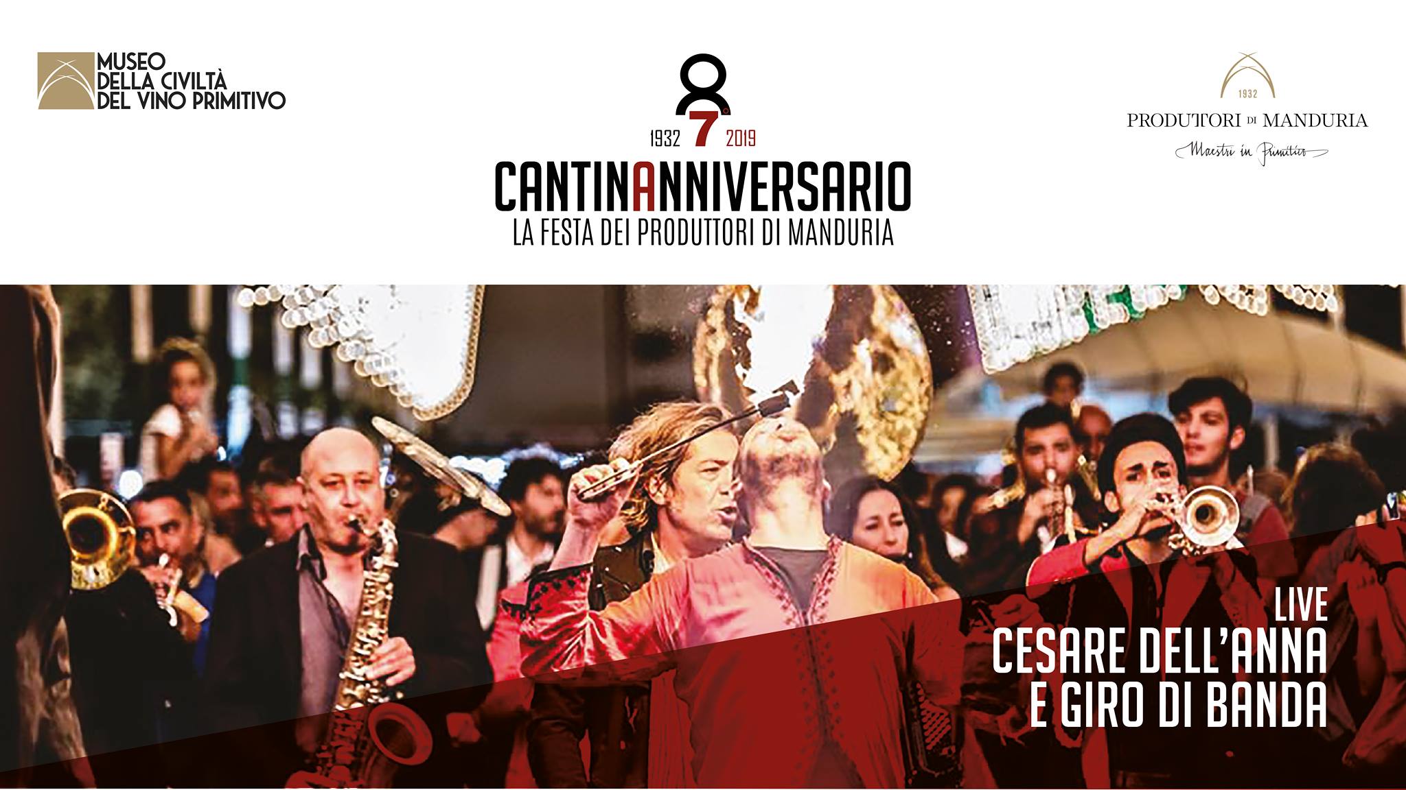 La cantina Produttori di Manduria compie oggi 87 anni. La storica cooperativa, come ormai accade con regolarità dal 2000, festeggerà anche quest’anno l’anniversario con una festa nell’ampio cortile della struttura vinicola, insieme a soci e amici. Ospiti della serata, per il tradizionale concerto, Cesare Dell’Anna e la sua band “Giro di Banda”.