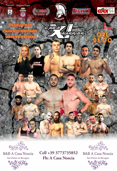 C’è grande attesa per l’undicesima edizione del Cage Warrior, un evento di sport da combattimento promosso dal Centurion Club di Manduria. Si svolgerà, nella centralissima piazza delle Perdonanze di San Pietro in Bevagna, sabato sera e proporrà ben 11 match, molti dei quali anche internazionali, fra dilettanti e professionisti delle MMA, le arti marziali miste.